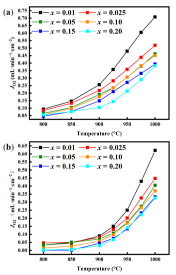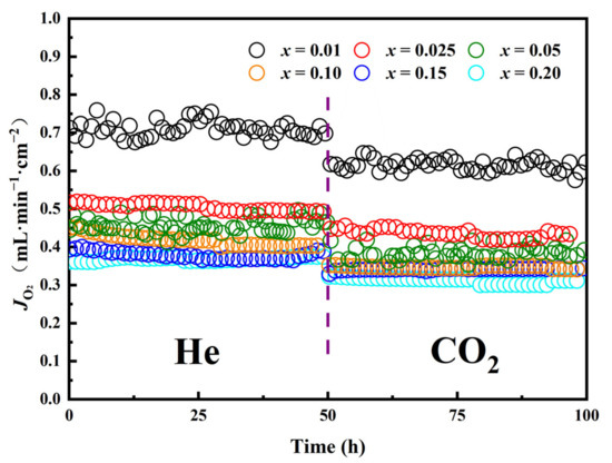 To investigate the effects of bismuth substitution on the oxygen permeability of 60CPO-40PSF1−xBxO OTMs, we tested the oxygen permeability for all the OTMs. We plotted JO2-T curves (Figure 5) in the temperature range of 800–1000 °C. From Figure 5, we can see that all the oxygen permeability through 60CPO-40PSF1−xBxO dual-phase OTMs increase with increasing temperature and reach a maximum at 1000 °C under either He or CO2 atmosphere because there are two main steps of oxygen transport in OTMs, bulk diffusion and surface exchange [40], which are influenced by the oxygen partial pressure difference between the feed side and the sweep side of OTMs, the thickness of OTMs, and the temperature. According to the equations of bulk diffusion and surface exchange [47,48], the number of oxygen vacancies increases with increasing temperature, and thereby, the oxygen diffusion can be enhanced in both ways. As shown in Figure 5, the oxygen permeation flux of 60CPO-40PSF0.99B0.01O OTM reaches 0.71 and 0.62 mL·min−1·cm−2 at 1000 °C under He or CO2 atmospheres, respectively.