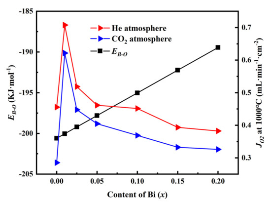 Figure 6 shows the JO2-x curves at 1000 °C under He and CO2 atmospheres. From Figure 6, we can see that the JO2 is much higher than that of the Bi-free 60CPO-40PSFO OTM when x = 0.01. However, when x > 0.01, as the content of Bi (x) further increases, the JO2 of the Bi-doped OTMs decreases. Overall, the JO2 under the air/He atmosphere is higher than that under the air/CO2 atmosphere because of the stronger adsorption of CO2 than that of He. There are several reasons that may explain the enhancement of oxygen permeability of 60CPO-40PSF0.99B0.01O. On the one hand, due to the larger radius of Bi ion and the lower valence state of trivalent, the doped OTM has a smaller tolerance factor and larger lattice parameters, creating more oxygen vacancies and enhancing the oxygen permeability. On the other hand, the larger the Bi dopant content is, the smaller the absolute value of the ABE (|ABE|) of B-site (EB-O) in this system (see Figure 6), making the oxygen ion transport easier and thus partially enhancing the oxygen permeability [47,49,50,51,52]. EB-O could be calculated by Equation (2) [50]: