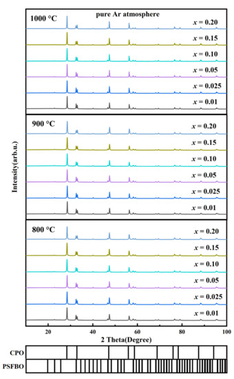 XRD patterns of the obtained 60CPO-40PSF1−xBxO powders after being calcined under pure Ar gas at 800, 900, and 1000 °C for 24 h.