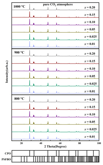 To investigate the stability of 60CPO-40PSF1−xBxO OTMs under a low oxygen atmosphere or CO2 atmosphere, the prepared composite powders were calcined at 800, 900, and 1000 °C under pure Ar or CO2 gas for 24 h. The phase structure of the powders after 24 h calcination under Ar and CO2 was characterized by XRD after grinding, and the patterns are shown in Figure 7 and Figure 8, respectively. From Figure 7, it can be found that the XRD patterns for the calcination samples are nearly the same as those of the fresh precursor powders. There are no new components or other impurities observed, indicating 60CPO-40PSF1−xBxO OTMs have suitable structural stability under a low oxygen atmosphere. Moreover, from Figure 8, there are also neither carbonates nor other impurities in the treated 60CPO-40PSF1−xBxO powders. All the treated powders under pure CO2 gas are still composed of the CPO phase and PSFBO phase, implying suitable structural stability under the CO2 atmosphere. Our results are different from the observations in some previous reports [19]. For example, Wang et al. [19] observed the formation of SrCO3 in the Cu-containing Ce0.85Pr0.1Cu0.05O2−δ-PrxSr1−xFe1−yCuyO3−δ OTMs at 800 °C under pure CO2 gas due to chemical reactions. Jian Song et al. [26] also reported that the carbonate was generated and adsorbed on the surface of the BaCo0.85Bi0.05Zr0.1O3−δ OTM, which greatly attenuated the oxygen permeability properties. Since all the 60CPO-40PSF1−xBxO OTMs do not contain carbonates, their stability can be ensured under the CO2 atmosphere.