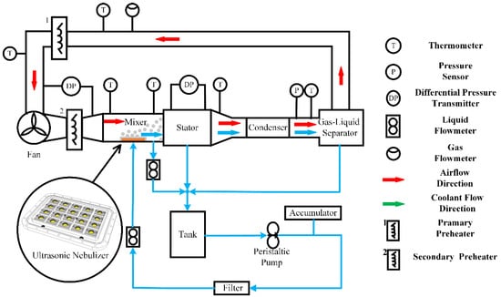 An experimental platform was used to verify the feasibility of an ultrasonic atomization device for CCSSECAC. Figure 2 is the schematic diagram. The platform was composed of two parts: the airflow path and the liquid path. The airflow path, identified by the red arrows, is the channel where air and coolant participate in a heat exchange cycle. The liquid path, represented by blue lines, is a set of pipe fittings that are specially used for the coolant in a liquid state. One function of the liquid path is to collect the overflow and condensate coolant. Another function of the liquid path is to supply the liquid for the ultrasonic atomizer.