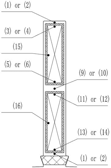 As shown in Figure 4, several T-type thermocouples were arranged in slots. All the even-numbered thermocouples were arranged in the positions corresponding to the ducts, and the odd-numbered thermocouples were arranged in the opposite positions. The thermocouples numbered (1) and (2), (7) and (8) and (13) and (14) were, respectively, arranged in the bottom, middle and top strips, that is, outside the main insulation. These thermocouples were arranged in all the slots. In the middle one of the seven slots, thermocouples were also placed inside the main insulation. The thermocouples numbered (3), (4), (5), (6), (9), (10), (11) and (12) were located inside the main insulation, corresponding to the thermocouples in the strips. They were used to measure the temperature gradient at the insulation.