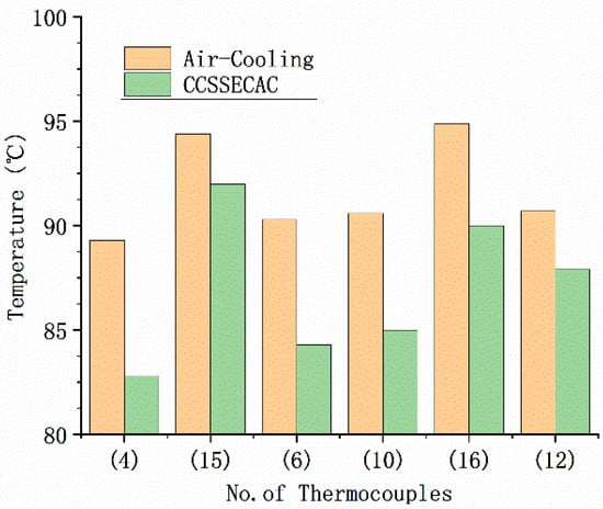 Figure 6 compares the values from six temperature measuring points placed inside the main insulation. In the figure, the arrangement sequence of the temperature measurement points from bottom to top in the slot is shown in the sequence from left to right. Temperature values were collected in the two working conditions of the maximum load of the air-cooling experiment and the maximum load of the CCSSECAC experiment. It can be seen that when the two temperature measuring points, namely, no. (15) and no. (16), were not considered, the temperature measured values rose successively from the bottom to the top of the slot. However, the temperature difference between these four points was not large. The temperature measured at the two points on the long side of the coil bar section was 3–5 °C higher than the above four points. The measurement of thermocouple (16) was therefore used to calculate the temperature rise.