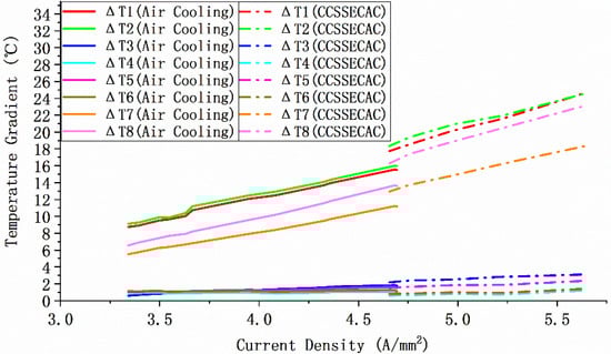 In this part, 50 °C was selected as the same temperature rise benchmark to compare the current density under different cooling conditions. The details of this comparison are given in Figure 9. At each airflow speed, CCSSECAC could achieve a current density that was at least 1 A/mm2 higher than air cooling. Since the copper loss is proportional to the quadratic power of the current, this degree of difference in current density shows a very substantial improvement for air-cooling systems. This benefit was more prominent when the airflow speed did not exceed 1 m/s. When the airflow speed reached 1.5 m/s, the airflow friction loss of CCSSECAC was twice that of the air-cooling system, while the heat dissipation capacity of CCSSECAC was only 70% higher than that of the air-cooling system. It is worth mentioning that CCSSECAC increased the current densities far beyond those of the air-cooling system, comparable to hydrogen cooling, when the hottest spot on the coil was no more than 90 °C.