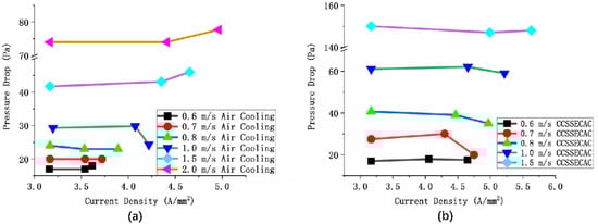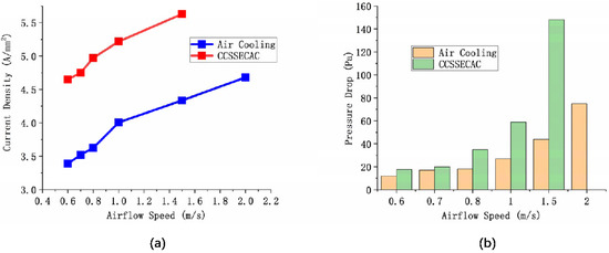 Comparison at a temperature rise of 50 °C: (a) current density at different airflow speeds and (b) airflow friction loss at different airflow speeds.