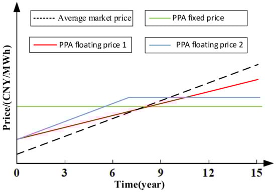 In terms of contract prices, renewable energy projects, such as solar and wind energy, generally use one-step pricing PPA, which only calculates the electricity tariff without the capacity tariff [21]. The current PPA prices include fixed electricity prices and floating electricity prices. A fixed electricity price means that both parties must always provide the contracted electricity at the same price during the contract period. The average market transaction price increases over time due to inflation and fuel price increases. Therefore, the fixed contract price may be higher than the average market price when the contract is first signed, while the fixed price may be lower than the average market price during the later period of the contract’s duration, as shown in Figure 2 by the black dashed line and the green solid line. Users who sign a fixed electricity price agreement can hedge against the risk of a sharp increase in market-based transaction prices. A floating electricity price means that the contract price changes over time. There are different types of floating electricity price. As shown in Figure 2, the red line means that the price will increase in a certain proportion during the contract period (for example, an annual increase of 2%). The blue line means that the contract price will increase by a certain percentage every year in the early period of the contract’s duration, while the price will be fixed during the middle and latter stages of the contract. The contract’s signatories can also divide the agreement duration into multiple periods and re-negotiate the price before the start of each period. They can also discuss other types of negotiated prices, according to their own conditions, research, and judgment about the future.
