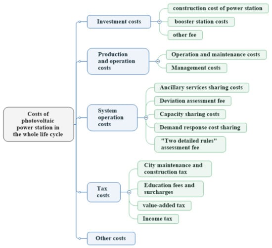 - The cost of a photovoltaic power plant throughout its life cycle includes construction costs, operation and maintenance costs, system operation costs, tax costs, etc. Among them, fixed assets are depreciated using the average life method, with a depreciation period of 25 years, and the residual value rate is 5%. According to statistics, the operation and maintenance costs are expected to rise slightly in the near future, and then remain generally stable in the long term, and the management costs will be almost constant after construction [44]. The deviation assessment costs, ancillary service allocation costs, and demand response allocation costs are calculated by referring to the data from a similar renewable energy power station in Gansu Province in 2020. China has not yet opened a capacity market, so capacity allocation costs are currently not considered. Considering that new energy companies enjoy multiple tax deductions and preferential policies in China [44], the tax cost accounts for a small proportion, so it is temporarily not considered in the calculation.