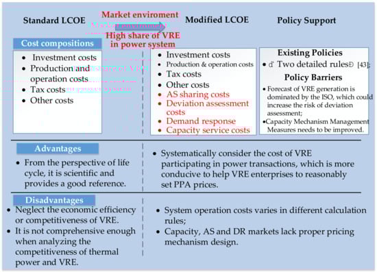 Compared with the standard LCOE model, the modified LCOE model systematically considers the lifecycle costs of variable renewable energy (VRE) in the market environment and high share of VRE in power system, especially the system operation cost, as shown in Figure 4. However, the system operation cost varies due to different market rules. Furthermore, a capacity market has not been built in China, and the relative mechanism needs to be improved. Moreover, the deviation assessment is based on the deviation between the ISO forecast results and the actual generation of the RE power plant. Given that RE power plants trade based on their own forecast results, this increases the risk of deviation deficit for RE plants to a certain extent.