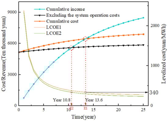 The investment payback period of the photovoltaic power station is analyzed by calculating its total cost, income, and net present value. The data shows that the total investment can be recovered at the end of the 13th year under the above assumptions, and the LCOE at this time is 340 CNY/MWh if calculated by the proposed method, as shown by the orange line in Figure 5 (LCOE 1). As shown by the dotted orange and blue lines in Figure 5, the total cost of the PV power station for the first 13.6 years is always greater than the revenue. After 13.6 years, the cumulative revenue is greater than the cumulative cost, which indicates that the power station starts to make profits. In order to assess the impact of system operation costs on the power station, the LCOE that does not consider the system operation costs is shown by the green line in the Figure 5 (LCOE2). While keeping the basic assumptions unchanged, a cumulative cost curve that does not include the system operation costs is added, as shown by the black dotted line in Figure 5. At this point, the intersection of the cumulative cost curve and the cumulative yield curve moves to the end of the 10.8th year, on the left, shortening the payback period by 3 years. It can be seen that system operation costs have a significant impact on the payback period for renewable energy companies.