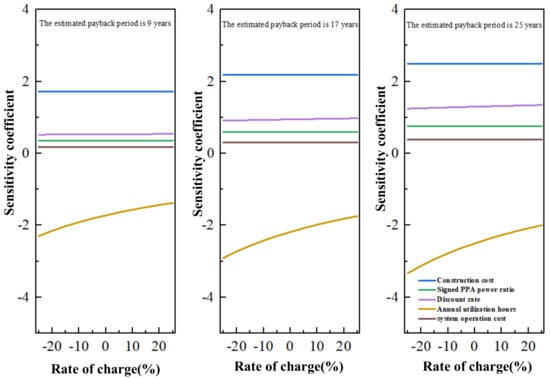 As shown in Figure 6, as the expected investment payback period increases, the sensitivity of PPA prices to various parameters grows. For the different expected investment payback periods, the sensitivity coefficient of the investment cost, the system operation costs, discount rate, and the proportion of electricity volume signed in the PPA is larger than 0, which means that these factors are positively correlated with the price of the PPA, while the number of annual utilization hours is negatively correlated with the PPA price. Among these factors, investment costs and annual utilization hours have the strongest impact on the PPA price, while changes in the system operation costs have the weakest impact on the price. The reason for this may be that the system operation cost accounts for only 1.88% of the construction cost under current market conditions, which leads to a much smaller impact on the negotiated price than that of other factors. In addition, there is a linear relationship between the construction cost, the proportion of electricity agreed when signing the PPA, the discount rate, the system operation costs, and the price of the PPA; while the annual utilization hours and the PPA price have a non-linear relationship, and as the annual utilization hours decrease, the PPA price becomes more sensitive to this factor.