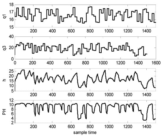 A typical nonlinear process, the PH neutralization titration process, is used as a case study to verify the effectiveness of the proposed method. The schematic illustration is shown in Figure 2. The process has three inputs: q1 (HNO3), q2 (NaHCO3), and q3 (NaOH). The three enter the reactor and are fully mixed and neutralized after mixing. In this case study, q1 and q2 are selected as the manipulation variables, and q3 is a constant value. The outputs are the PH value and the level of reactor h (cm). The model of the process consists of three nonlinear ordinary differential equations and a nonlinear equation, which is shown in Equation (45) [40]. The parameters of the model are shown in Table 1.