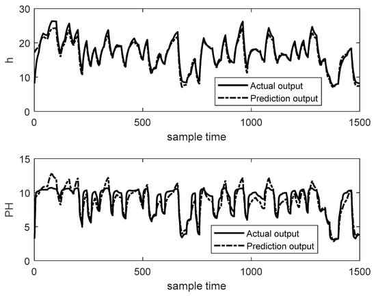 In this case study, the number of latent variables in the proposed model R is 2. The fuzzy rule of each sub-latent variable model is 2. The model order of consequent is na = 1 and nb = 1, and the fuzzy exponent is 2. The other data set (1500 samples) generated is used for cross validation; the validation results are shown in Figure 4. Here, a new norm shown in Equation (46) is used to measure the accuracy of the model.