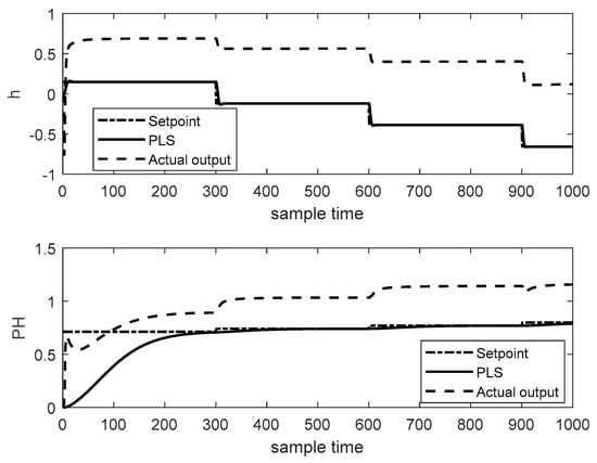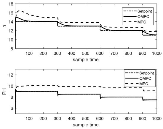 In the method used in reference [41], the parameters of the PLS model are identified and modified adaptively. This method will increase the computational burden and cause a large fluctuation of the system because it involves updating the internal and external models of the dynamic PLS model at the sample time of the parameter change and some subsequent sampling moments. The method proposed in this paper can still make the output of the system track the setpoints through its feedback when the model parameters of the system change and the fluctuation is small. For the nonlinear PH variable, there are static errors in both methods. The static error of the proposed method is 0.027, less than that of the method in reference [41], which is 0.055. This is because the proposed model is not reidentified when the model parameters changed.