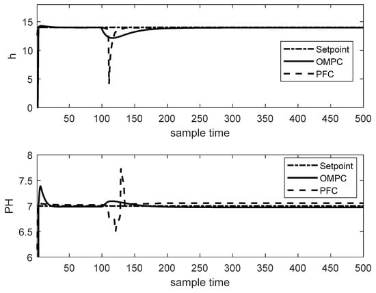 To verify the control effect when the parameters of the actual system change or the model parameters are uncertain, the method proposed in this paper is compared with the predictive function control based on the adaptive dynamic fuzzy PLS model introduced in reference [41] (denoted as PFC). In the following simulation, the model parameter Cv is modified to simulate the actual system change. A 500-step simulation is performed. At the 100th step, Cv is changed from 8.79 to 9.79. The results are shown in Figure 7.