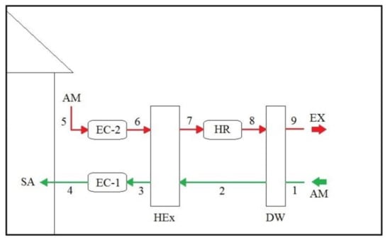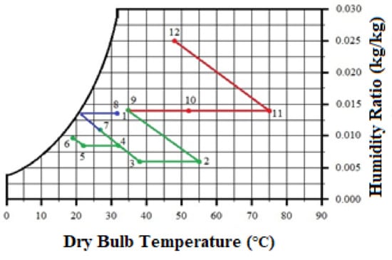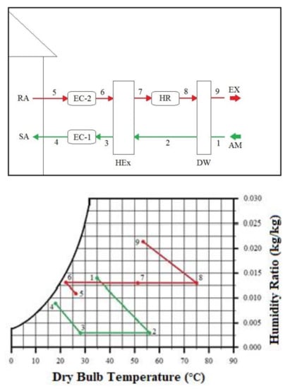 According to the International Energy Agency in 2012, HVAC systems in the building sector are the most energy consuming devices, contributing 10–20% of the final energy consumption in developed countries. Thus, the increase in energy efficiency for HVAC systems plays an important role in energy policies worldwide []. Providing cooling by utilizing renewable energy, such as solar energy, is one solution to address the energy issues. Desiccant-based solar cooling is one of the most promising methods of utilizing solar energy for the purpose of air conditioning. This system is a combination of dehumidification, refrigeration, cooling with the help of an evaporative cooler, and finally regeneration of the desiccant system by a heat source, in order to provide and maintain the desired room temperature and relative humidity with enhanced efficiency of energy use []. So, compared to conventional systems, desiccant-based air conditioning provides efficient control of room temperature along with relative humidity, while consume less electrical energy []. Almost all air-conditioning systems essentially handle two kinds of load, namely sensible load and latent load. The sensible load is due to temperature differences, while latent load is due to moisture []. Conventional air-conditioning systems do not have any separate arrangements for handling sensible and latent load. Here, the evaporator coil can handle both sensible as well as latent load. When handling latent load in conventional air-conditioning systems, it is necessary to maintain the temperature of the evaporator coil below the dew point temperature of the inlet air. So it is again required to reheat, which implies poorer energy efficiency. In desiccant-based air-conditioning systems, latent cooling is performed by desiccant dehumidification and sensible cooling by evaporative cooling or refrigeration. Thus, a considerable part of expensive vapor-compression refrigeration is replaced by inexpensive evaporative cooling.