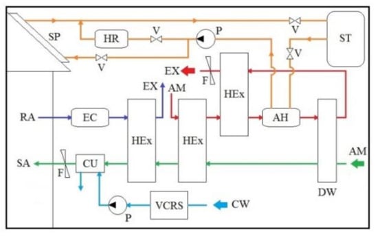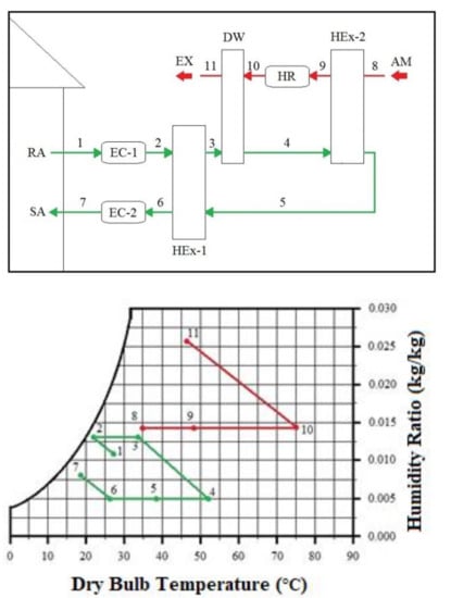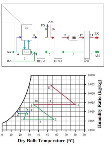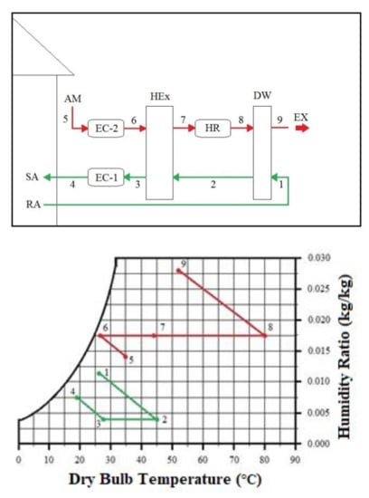 The desiccant dehumidification and cooling system (DDCS) is the best alternative for the VC system as it overcomes the traditional system’s disadvantages and is more economical and easily accessible. The DDCS decreases the operational costs and work more significantly when powered by solar energy [,,].