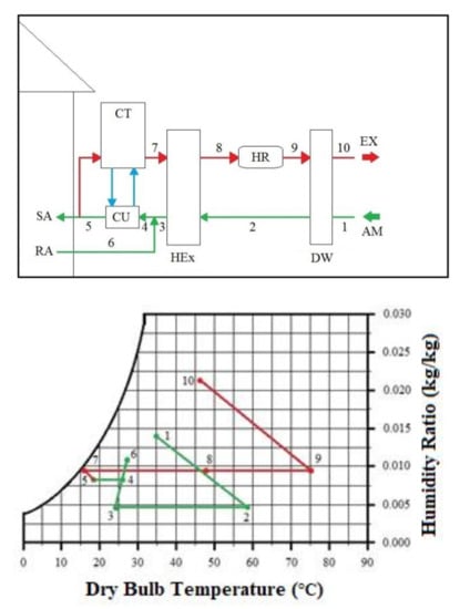 - Bourdoukan, P.; Wurtz, E.; Joubert, P. Comparison between the conventional and recirculation modes in desiccant cooling cycles and deriving critical efficiencies of components. Energy 2010, 35, 1057–1067. [Google Scholar] [CrossRef]
