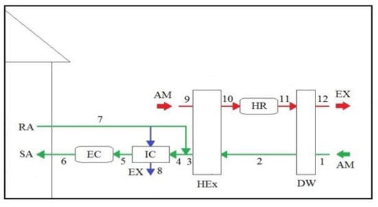 The rotary desiccant cooling cycle, as shown in Figure 2, was proposed by Pennington in the mid 1950’s and is named the Pennington cycle or ventilation cycle. In this cycle, ambient air and exhaust air streams pass through different stages of heat and desiccant wheels. In the first stage, ambient air passes through desiccant wheel, where air moisture is absorbed and temperature is increased. This hot, dry air then passes through a heat exchanger (HEx), where sensible cooling takes place. The process air is then passed through the evaporative cooler (EC), where its temperature is further lowered. Finally, the air is supplied to the room at EC exit conditions.