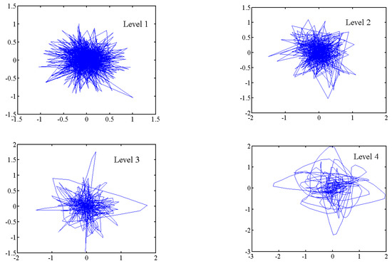 Figure 7 shows the delay representation of the considered system for wavelet components 1–10 with the proper selection of embedding parameters and delay time. As seen in the figure, for the low levels, which represent the high-frequency band, the dynamics of the component are complex. As the level increases, the complexities of dynamics decrease progressively. The dynamics tend to be nearly periodic toward a higher level 10 and lower frequency.