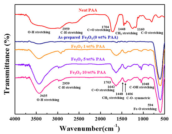 The FTIR spectra of as-prepared Fe3O4 and Fe3O4 modified using 1, 5, and 10 wt % PAA are shown in Figure 1. In the spectrum of neat PAA, the peaks were observed at 1448 and 2959 cm−1 attributed to CH2 stretching and C–H stretching modes, respectively. In addition, the peaks ascribed to C–O and C=O stretching modes in carboxyl groups were observed at 1160 and 1704 cm−1, respectively [22]. Near the range of 2760–3744 cm−1, the broad peak associated with the O–H stretching mode was observed. The spectra of Fe3O4 samples show the peak of the Fe–O stretching vibration at 594 cm−1, confirming that the particles were based on iron oxide [23]. After surface modification with PAA, new peaks associated with CH2 stretching and C–H stretching modes were observed at 1448 and 2959 cm−1, respectively. These peaks are ascribed to the organic polymer structure of PAA, the precursor. Other new peaks associated with the C–O symmetric stretching mode were observed at 1048 and 1406 cm−1. The peaks assigned to the C–OH stretching mode and C=O stretching mode were observed at 1048, 1642, and 1704 cm−1, respectively. In addition, the broad peak observed near 3435 cm−1 was associated with the O–H stretching mode. These peaks are attributed to carboxylic acid or carboxyl groups at the terminal of the PAA structure [24,25]. It is deduced that the surface was successfully modified, where the organic structures of PAA caused a change in the particle surface due to the reaction between the Fe3O4 nanoparticles and the precursor PAA, based on observation of the new peaks in the spectrum of the treated particles.
