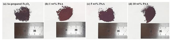 Images of as-prepared Fe3O4 and modified particles are presented in Figure 6. The images show that the color of the samples changed after surface modification using PAA. The color of the modified particles was different from the dark brown color of as-prepared Fe3O4, where the color change was dependent on the PAA content. Fe3O4–1 wt % PAA exhibited a reddish-brown color compared to as-prepared Fe3O4. The color of Fe3O4–5 wt % PAA and Fe3O4–10 wt % PAA was close to purple. The observed color changes are consistent with the CIE Lab coordinates in Figure 5 and Table 2. This indicates that the optical properties of the particles can be adjusted by changing the structure of the particles through surface modification using PAA.
