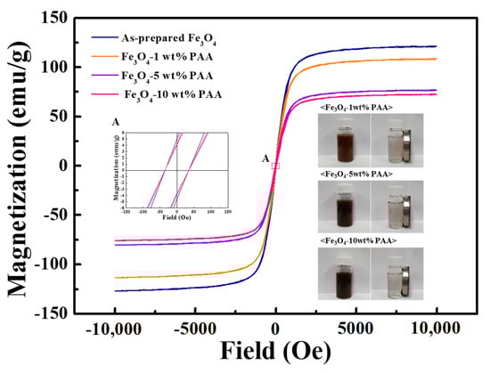 The magnetic properties of as-prepared Fe3O4 and Fe3O4 modified using various PAA contents were analyzed using VSM. From the magnetization curves in Figure 7, it was determined that all samples had extremely low (nearly zero) remanence (Mr) and coercivity (H). In addition, in the liquid state, the samples maintained the dispersed state in the absence of an external magnetic field and could be separated from the liquid under an external applied magnetic field (images in Figure 7). It is deduced that Fe3O4 has superparamagnetic properties, and the Fe3O4–PAA samples also exhibit this property even after surface modification. The saturation magnetization (Ms) of the as-prepared Fe3O4 and Fe3O4 modified using 1, 5, and 10 wt % PAA was quantified to be 120.85, 108.11, 76.54, and 72.22 emu/g, respectively. The Ms value of Fe3O4−PAA decreased by 40.2% compared with that before surface modification. This can be attributed to the decrease in the density owing to dissociation of the particles. It was also inferred that the Ms value of Fe3O4−10 wt % PAA decreased because of the increase in the particle weight due to the formation of the surface layer. It was confirmed that the magnetic properties were affected by changes in the structural factors of the Fe3O4 nanoparticles due to surface modification.