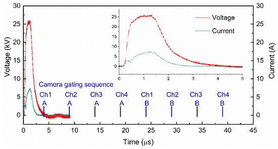 Example of the waveforms of the discharge pulse, as well as the sequence of the camera gating.