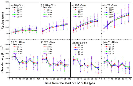 (a–d) Expansion of the radius of the gas filament. (e–h) The temporal evolution of the density of gas in the gas filament corresponding to (a–d), respectively. The value of each point is averaged from many filaments that were remained by different HV pulses.