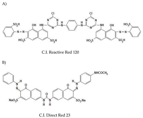 Chemical structures of the tested dyes: (A) Reactive Red 120, (B) Direct Red 23.