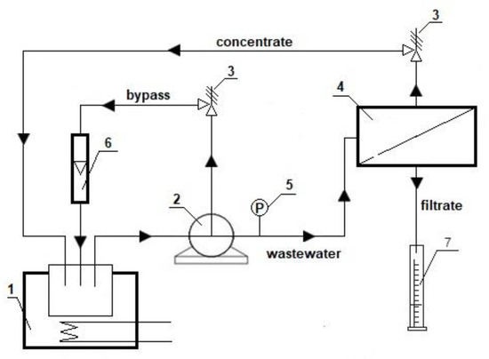 Schematic diagram of the nanofiltration system: 1—thermostat; 2—pump; 3—control valves; 4—pressure chamber with the membrane; 5—manometer; 6—rotameter; 7—measuring cylinder.