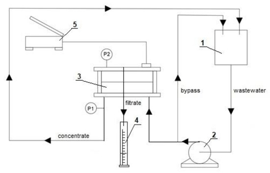 There are relatively few comprehensive publications covering the treatment of textile wastewater and its closed-loop reuse in other technological processes [2,14,15,16]. Kaya et al. [15] used commercial NF membranes, a loose FM NP010 membrane and a tight FM NP030 membrane (Microdyn-Nadir GmbH, Kasteler, Wiesbaden, Germany), to treat model wastewater containing two anionic surfactants (linear alkyl benzene sulfonate and sodium lauryl ether sulfate), one nonionic surfactant (nonylphenol ethoxylate), a dye (tartrazine), and NaCl. The authors examined the influence of pH (3, 5, 7, and 10), temperature (25 and 40 °C) and transmembrane pressure (8, 12, 16, and 20 bar) on the membrane performance. The experimental results showed that the recovered permeate had the same operational parameters as the water used in the first stage of the process. However, it was not verified in the study whether the treated wastewater could be successfully used in other technological processes. Applying multiple filtrations, Balcik-Canbolat et al. [2] the investigated fouling and reuse potential of membranes. Three options of NF, RO, and NF/RO hybrid systems were investigated in order to evaluate the feasibility of membrane processes for real dye bath wastewater considering overall water recovery, membrane fouling, and reuse potential of membranes. The results obtained showed that only NF was not suitable to produce sufficient quality for reuse of wastewater in the textile industry as process water, while RO successfully provided sufficient permeate quality. The results suggest that the integrated NF/RO membrane process is able to reduce membrane fouling and enable the long-term operation of real dye bath wastewater [2].