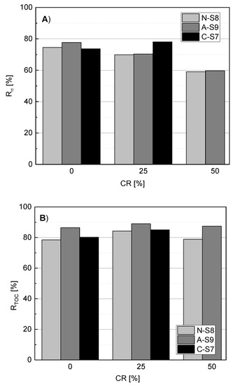 Figure 6 shows the conductivity and the TOC reduction values calculated for selected MTWs, which turned out to be relatively high. According to other researchers, the retention of NaCl on nanofiltration membranes usually ranges from 20% to 40% [18,27]. During the concentration of the MTW containing N-S7 or A-S8, the reduction in conductivity was smaller. Therefore, the results are consistent with the literature data. During the transport of solutes from the feed solution onto the membrane surface, the concentration of the solute on the surface is higher than in the feed, leading to concentration polarization. This causes a gradual increase of salt concentration in the permeate [13]. For MTWs containing a cationic surfactant, the effect was opposite, i.e., the rejection of salt increased. This may have implied strong adsorption of organic compounds onto the membrane surface. A heavily fouled membrane often shows better separation properties because of the reduction in pore size.