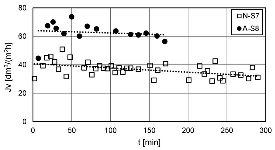 The second stage of the integrated treatment process, i.e., the reverse osmosis of the model wastewater containing either an anionic (A-S8) or a nonionic (N-S7) surfactant, was carried out at a pressure of 3 MPa. The observed changes in flux with time are shown in Figure 8.