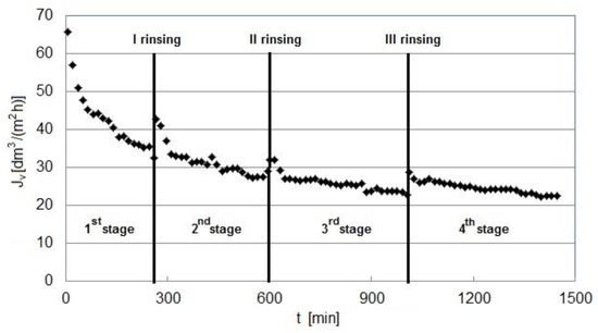 In order to confirm that the AG membrane was useful for multistage treatment, additional RO experiments were carried out using the model feed. The entire process was divided into four stages. After each stage, the membrane was regenerated by washing in citric acid. Figure 10 shows the observed changes in the permeate flux with time. The flux decreased with time in each individual treatment stage. The highest flux occurred at the beginning of the first stage, when the membrane was fresh and the treatment time was the shortest. Simultaneously, the drop in flux during the first stage was the largest. Each subsequent stage took longer than the previous one, with a smaller drop in flux. Washing the membrane after each stage was not effective enough as it regenerated the membrane only to a certain extent. With each successive stage, the regeneration became less effective due to the phenomenon of irreversible fouling, i.e., the deposition of components of the feed on the surface and in the pores of the membrane. Therefore, washing with the citric acid solution regenerated the membrane only to a relatively small degree.