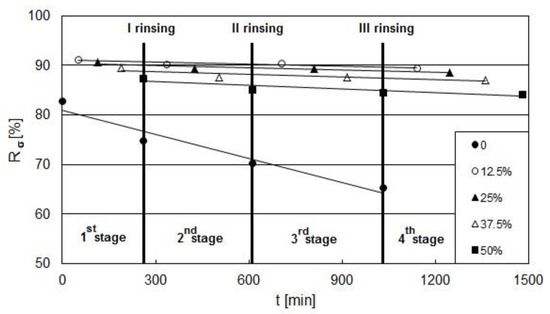 Conductometric measurements of salt concentration before and after the purification process allowed the reduction in conductivity (Rσ) to be calculated. When the MTW containing the nonionic surfactant (N-S3) was used, the Rσ ranged from 84% to 92% depending on the concentrate ratio (CR) at the consecutive stages of RO (see Figure 11, stages 1–4). With time, the Rσ decreased (Figure 11), which was particularly evident for the initial zero CR. This may have resulted from the negative influence of concentration polarization at the membrane surface. At the same time, the Rσ of a single process stage was the highest when the CR was 12.5% and decreased with increasing concentration and time. The concentration (i.e., conductivity) increased slightly in the filtrate and very strongly in the concentrate as a function of time. A similar tendency was observed by Allegre [4]. However, the retention rate slightly decreased (90–85%) with time and with the concentration of the concentrate (see Figure 11) in subsequent stages of the process. This tendency is shown in Figure 11.