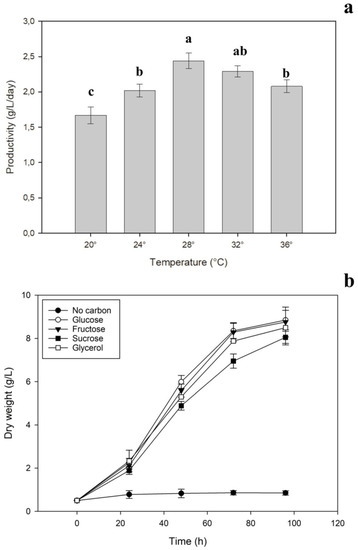 Productivity and growth curves of A. mangrovei RCC893 at different growth temperatures (a) and organic carbon source (b) on an orbital shaker. Values are reported as mean ± SD. Different letters in the same graph show the statistical difference among the treatments.