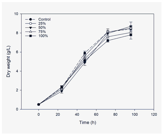 For all the growth tests, aliquots of the culture volume were taken every 24 h and transferred in weighted dry tubes, then centrifuged at 5000× g for 10 min. The supernatants were discarded and the pellet was washed with phosphate buffered saline (PBS) and dried overnight in the oven at 105 °C to obtain the dry cell weight (DCW) [14].