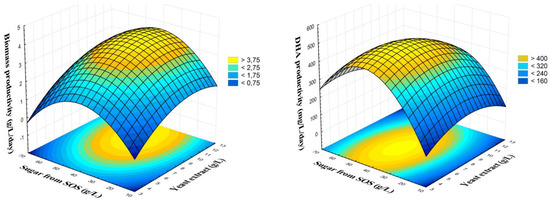 Based on an ANOVA analysis, both factors (amount of yeast extract and sugars) showed a significant impact on the biomass productivity of A. mangrovei. Figure 4 reports the three-dimensional plot of the response surface results, which allows us to visualize the interactions between factors on the biomass and DHA productivity.