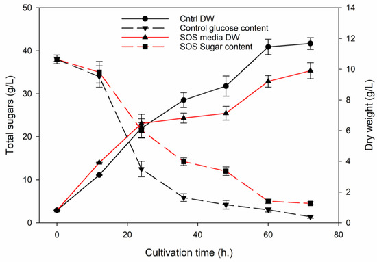 Sugar consumption followed the biomass increase, with values after 72 h of cultivation lower in pure glucose (2.1 g L−1) than in the SOS recipe (4.6 g L−1).