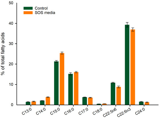 Fatty acid profile (expressed as % of total fatty acids) of the new SOS media compared with the control, using glucose as an organic carbon source. Values are expressed as mean (n = 3) ± SD.