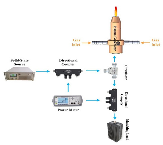 Figure 2 shows the schematic diagram of the plasma experimental system. This experimental system contains a solid-state source, a circulator, a dual-directional coupler, a matching load, a waveguide-to-coax converter and the plasma generator. The microwave power can be provided by specific frequency solid-state source, which is connected to a circulator and protected by it. A dual-directional coupler, linked to port 2 of circulator, is employed to measure the input and reflected powers with two power meters (AV2433, the 41st Institute of China Electronic Technology Group Corporation, Qingdao, China). The matching load is connected to the circulator port 3 for absorbing reflected power. The wave-to-coax converter is isolated to the other port of a dual-directional coupler to couple the microwave power to the coaxial structure. Argon with 1%, 2%, 3%, 4%, 6% and 8% humidity, its value is measured by humidity transmitter (LY60P-2X, ROTRONIC OEM, Bassersdorf, Switzerland), flows into the coax through four gas inlets. Its inflow rate is controlled by a flow controller (LF420-S, LAIFENG TECHNOLOGY CQLTD., Chengdu, China), which was adjusted to 8 L/min. The plasma emission spectra are measured by an optical emission spectrometer (AVSRACKMOUNT-USB2, Avantes, Apeldoorn, The Netherlands). Its optic probe is placed on the exit plane of the nozzle and 8 cm away from the nozzle horizontally. In this experiment, we set the input power to 20 W at frequency 2450 MHz and 5800 MHz.