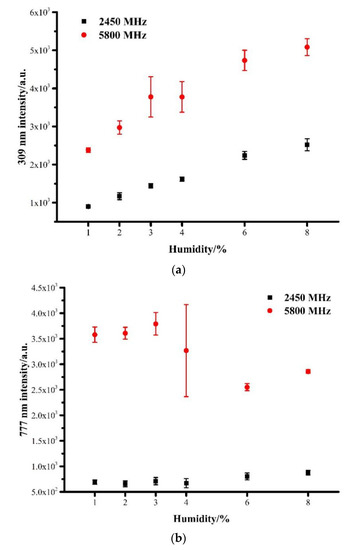 The emission spectra absolute intensity varies with humidity at different frequencies, (a) OH 309 nm line (integration time of 200 ms) and (b) O 777 nm line (integration time of 30 ms). Error bars represent the standard deviation of the measurements.