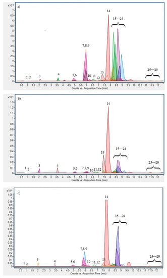 UPLC-MS/MS chromatogram in MRM acquisition mode of Laurus nobilis L. leaf extracts obtained by optimized extraction conditions of CRE (a), MAE (b) and UAE (c): (1) rosmarinic acid, (2) syringic acid, (3) 3,4-dihidrobenzoic acid hexoside, (4) protocatechuic acid, (5) chlorogenic acid, (6) p-hydroxybenzoic acid, (7) caffeic acid, (8) epicatechin, (9) catechin, (10) procyanidin trimer, (11) luteolin-6-C-glucoside, (12) kaempferol-3-O-deoxyhexoside, (13) p-coumaric acid, (14) rutin, (15) apigenin, (16) quercetin-3-glucoside, (17) ferulic acid, (18) luteolin, (19) kaempferol-3-rutinoside, (20) quercetin-3-pentoside, (21) kaempferol-3-O-hexoside, (22) isorhamnetin-3-hexoside, (23) quercetin-3-rhamnoside, (24) kaempferol-3-O-pentoside, (25) gallic acid, (26) apigenin-6-C-(O-deoxyhexosyl)-hexoside, (27) epicatechin gallate, (28) myricetin, (29) epigallocatechin gallate.
