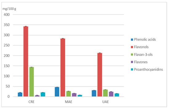 The content of different groups of polyphenolic compounds determined by UPLC-MS/MS in extracts obtained by CRE, MAE and UAE.