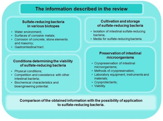This review focuses on the following main points: SRB in various biotopes, conditions determining their viability, molecular aspects of cryopreservation, cultivation and storage, preservation of intestinal microbial communities and their viability and comparison of the obtained information with the possibility of application to SRB (Figure 1).