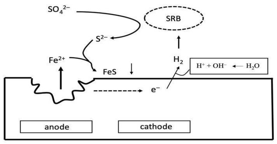 SRB consume H2, and as a result, depolarize the cathode. When Fe2+ is released from the anode, a depression is formed in the metal and insoluble FeS is created. H+ from ionizing water is combined with electrons to form H2 for SRB [2].