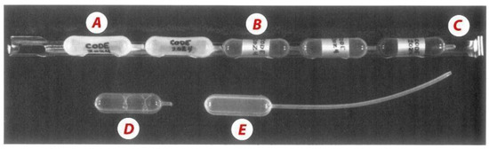 Pasteur pipettes. As a possible alternative to plastic cryovials, disposable plastic Pasteur pipettes (Figure 5) are also available [82]. The Figure 5 shows a sealed Pasteur pipette “head” labeled with a felt-tip pen (A), a sealed Paster pipette “head” labeled with a ball-point pen (B), an aluminum stand for holding pipettes during cryopreservation (C), part of the pipette after separation of the tip from the rest of the pipette and subsequent sealing of the end with a 2 mL volume of liquid (D), and an unmodified pipette (E). These plastic pipettes are made of polyethylene and have a 4 mL capacity with dimensions of 4.2·1.4 cm and a tip length of about 11 cm.