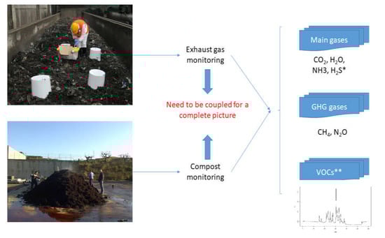 Monitoring exhaust gases from a composting process. * H2S is only significantly observed when anaerobic conditions prevail in the composting process. ** VOCs: Volatile Organic Compounds, a wide group including families such as alcohols, aldehydes, alkanes, aromatic hydrocarbons, carboxylic acids, ketones, nitrogen compounds, phenols, sulphur compounds, and terpenes, among others.