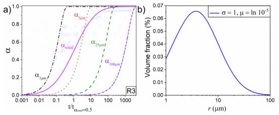 (a) Fractional reaction as a function of normalized time for different particle sizes. The overall values for the sample are plotted as a pink solid line. (b) Lognormal PSD with and .