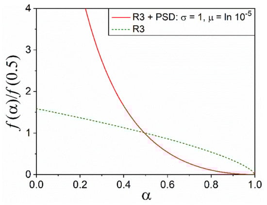 For the sake of clarity and ease of comparison with other models in the literature, the kinetic model was normalized to its value for 0.5. The normalized kinetic model is represented as a function of the extent of the reaction in Figure 2. The ideal model R3 is also plotted in Figure 2. Consistently with the results shown in Figure 1a, the kinetic model is significantly modified when we take PSD into account.